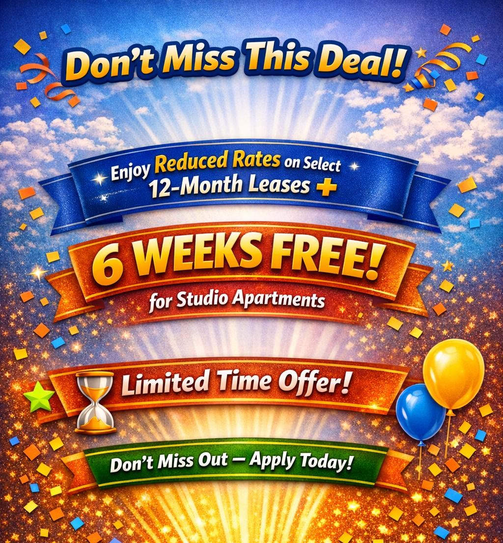 ✨ Sign a 12‑Month Lease and Get 6 WEEKS FREE on Select Studios! ✨ 🎉 Reduced rents + free rent = major savings! Your new home is waiting — and now is the perfect time to make the move.